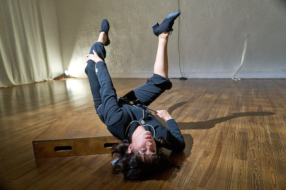 Apples, bitter appliances, wooden shoes wander and convene in a solo study, Hoist, created and improvised by Jesi Cook. The body is electric, lonely, then sagging. The physicality of sound making. Time unrolls like a wet carpet turned tumbleweed. An undetermined collection of scores meddle and fidget, playing the architecture of the Chocolate Factory Theater.
